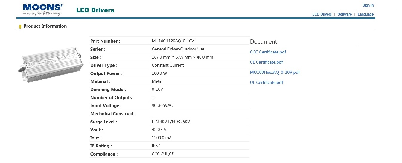 You also can access to MU100H120AQ_0-10V to gain the detailed information of this LED driver. You can gain the related certificate and data sheet.