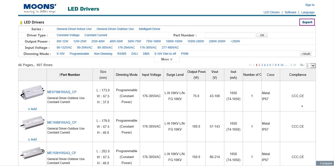 You can export the list of MOONS¡¯ LED driver before searching or after searching.